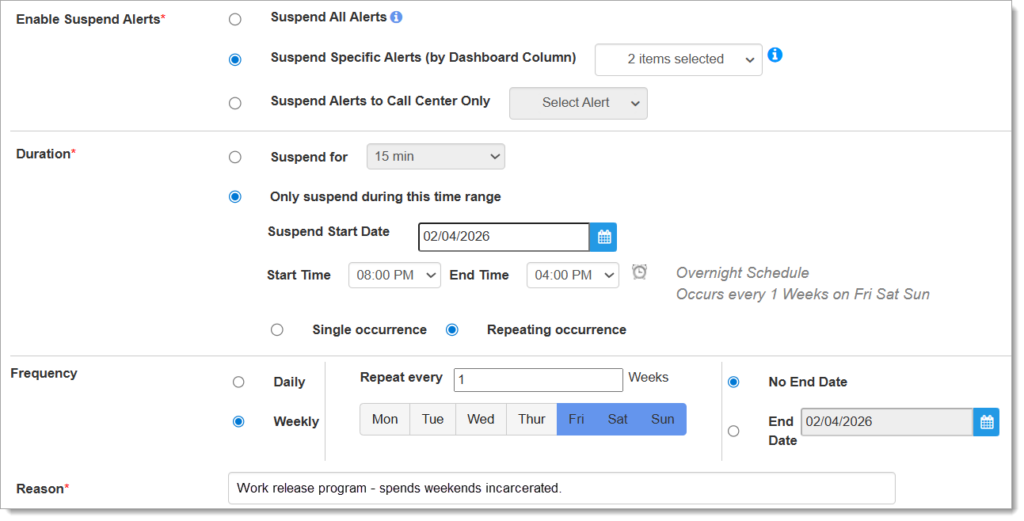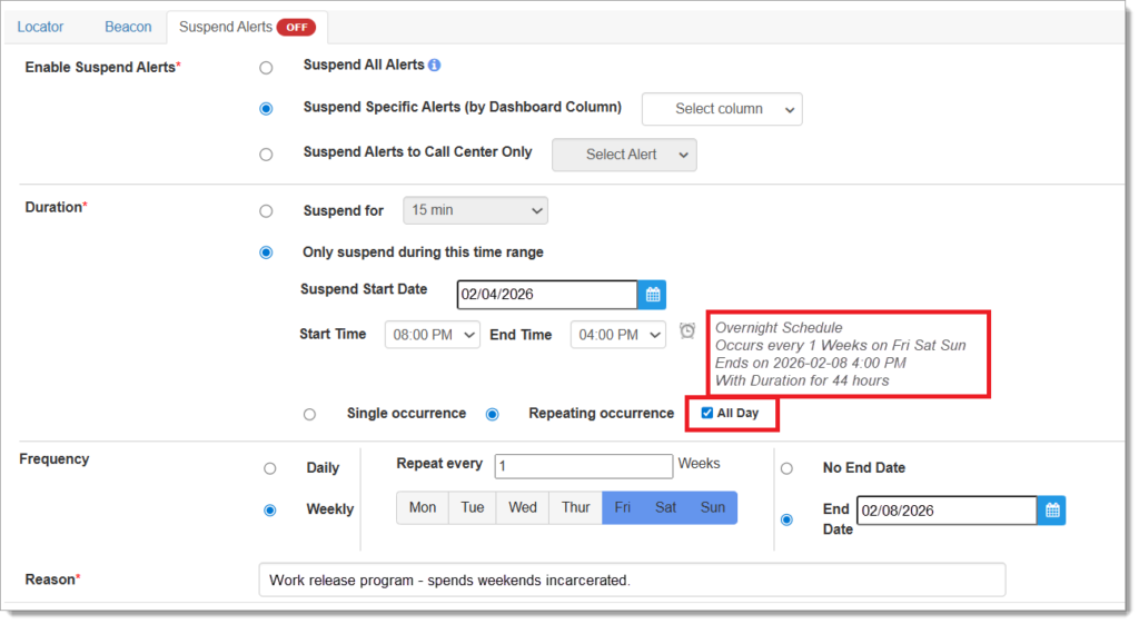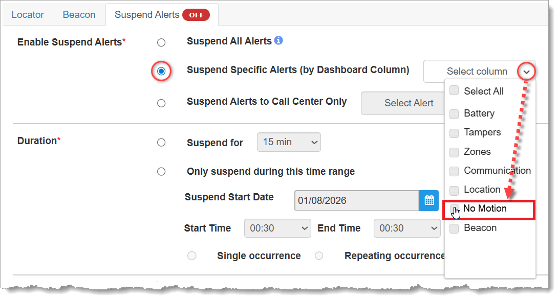 Under the suspend alerts section, SCRAMNET GPS users are now able to include or exclude No Motion alerts from the alert suspension process.