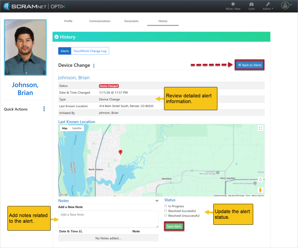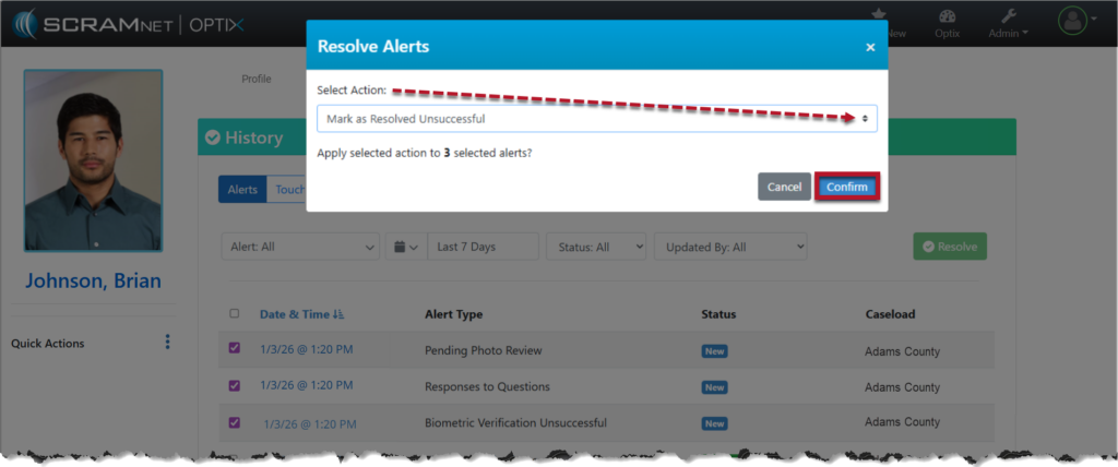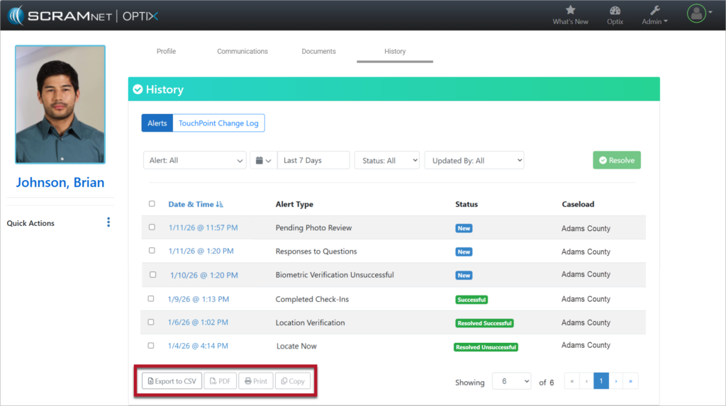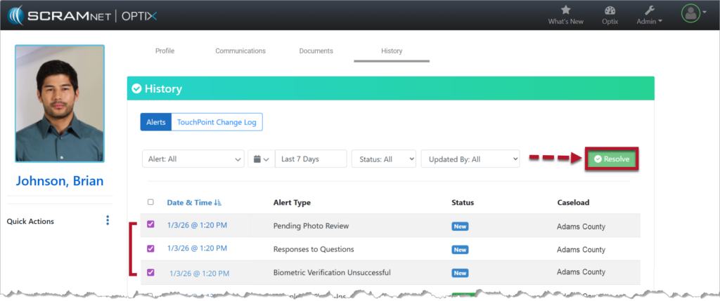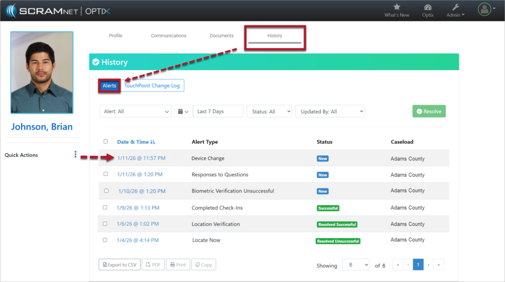 On January 28, 2026, SCRAM Systems will release an enhancement for your SCRAM TouchPoint caseload. This enhancement updates how alerts are displayed and managed in Optix. Alerts now appear individually in a list on the client’s History tab, providing clearer visibility into client activity. Agents may open alerts to view details, add notes, update statuses, resolve alerts individually or in bulk, and export alert records as needed.