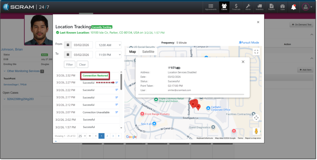 On March 12, 2026, SCRAM Systems will release an enhancement to your TouchPoint Monitoring program. For clients who are enabled for the SCRAM TouchPoint Location Tracking service, their smartphone’s location data will be captured and stored during periods without network or internet connectivity. Once service is restored, the stored data will be transmitted to the system.