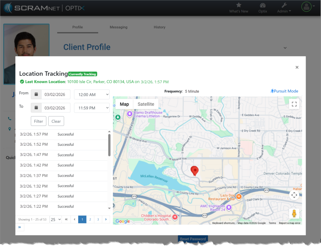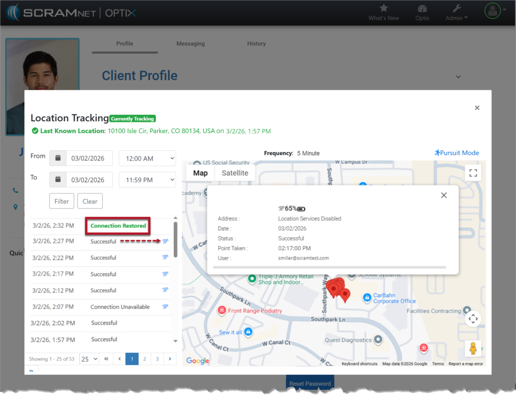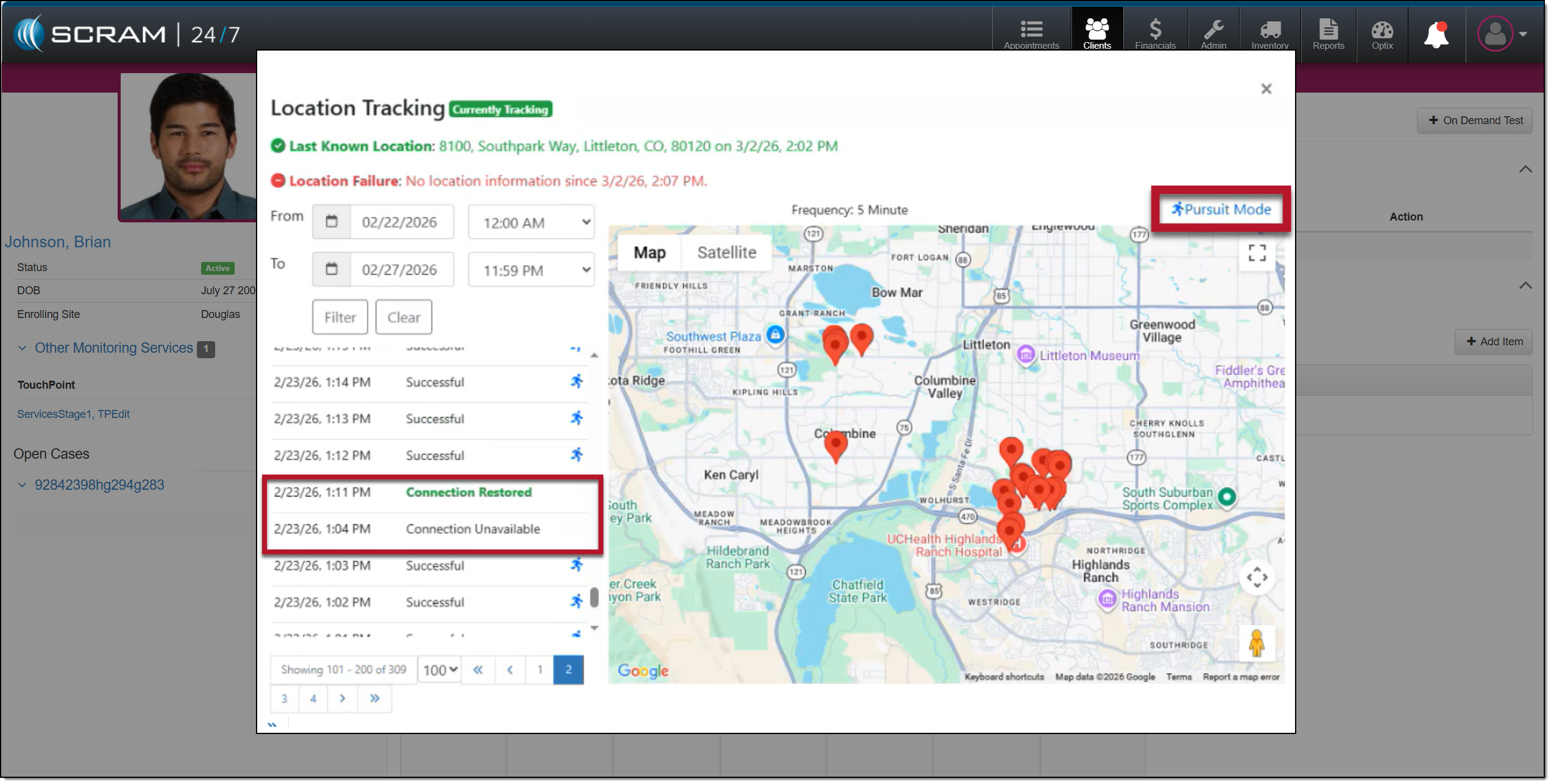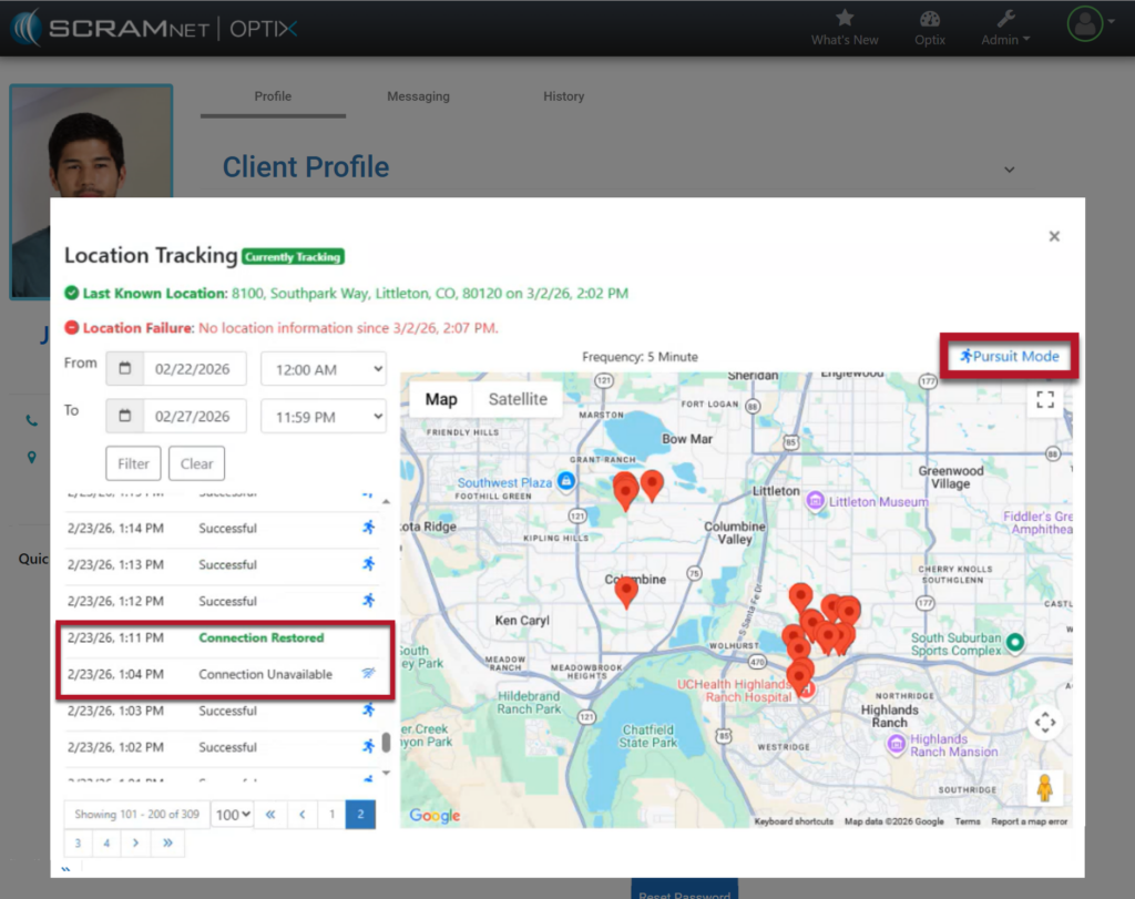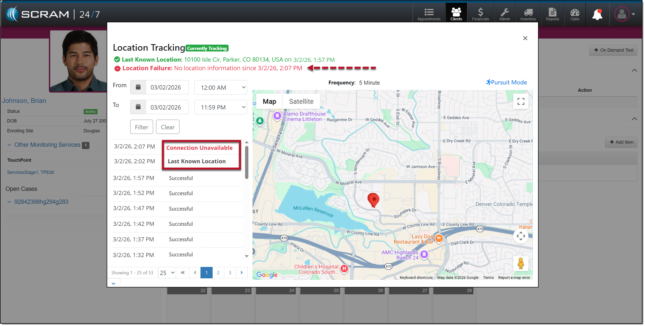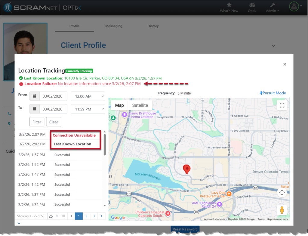 During the 15-minute Pursuit Mode window, if connectivity is lost the location table will display “Connection Unavailable,” and the red failure banner will display in the Location Tracking pop-up window.