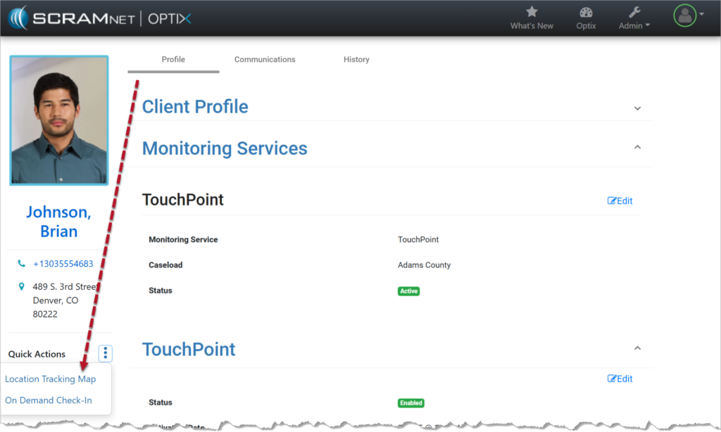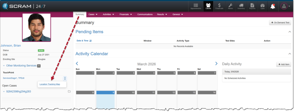 - View the Location Tracking Map by selecting the ellipsis next to the client’s name in the Other Monitoring Service, TouchPoint section.