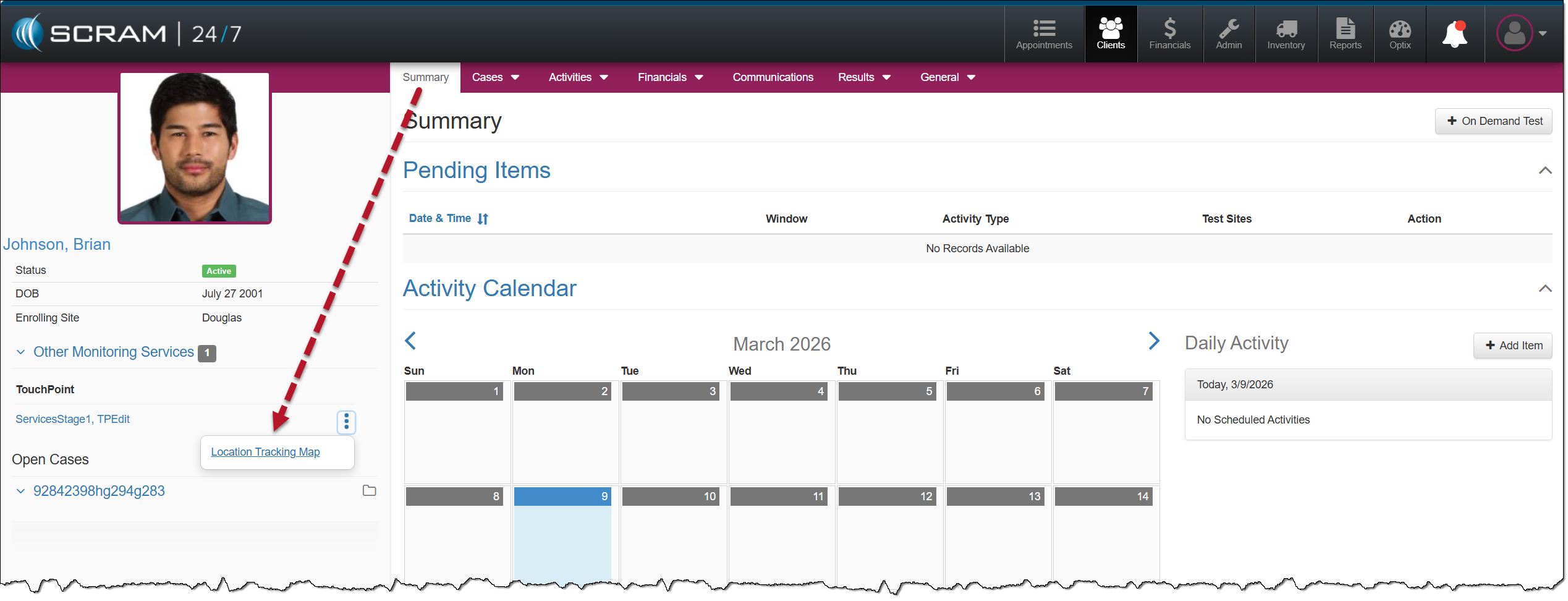 From the Client Profile page, select Location Tracking Map from the Quick Actions dropdown ellipsis menu.