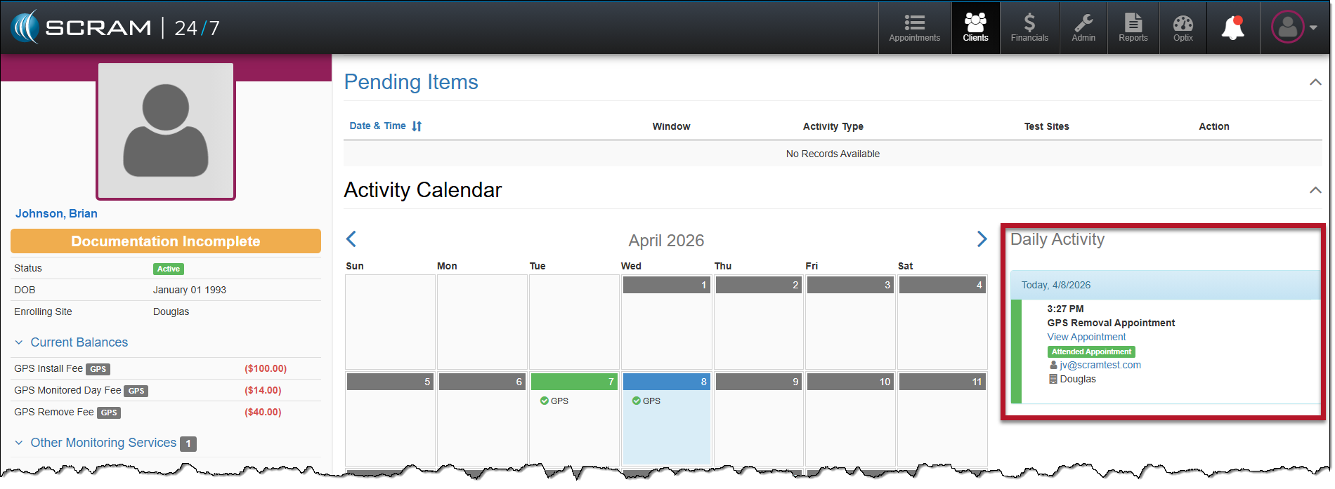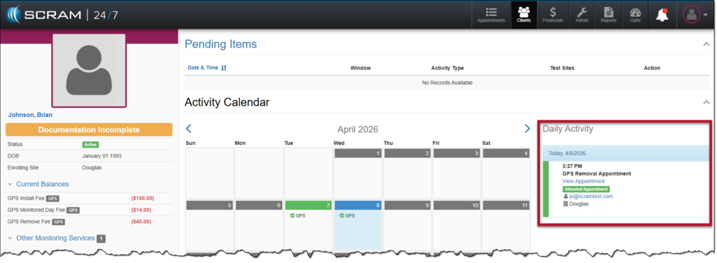 On the client’s Summary page, the Activity Calendar and Daily Activity stream will reflect a completed GPS Removal Appointment.