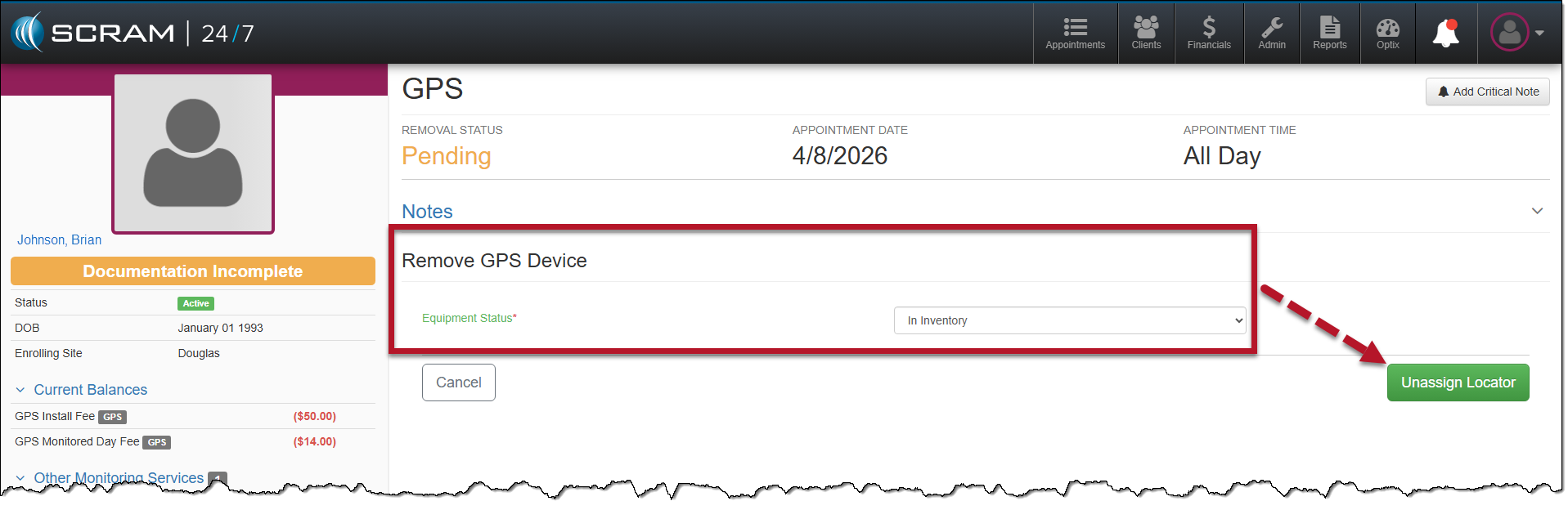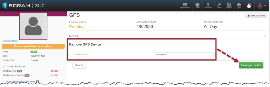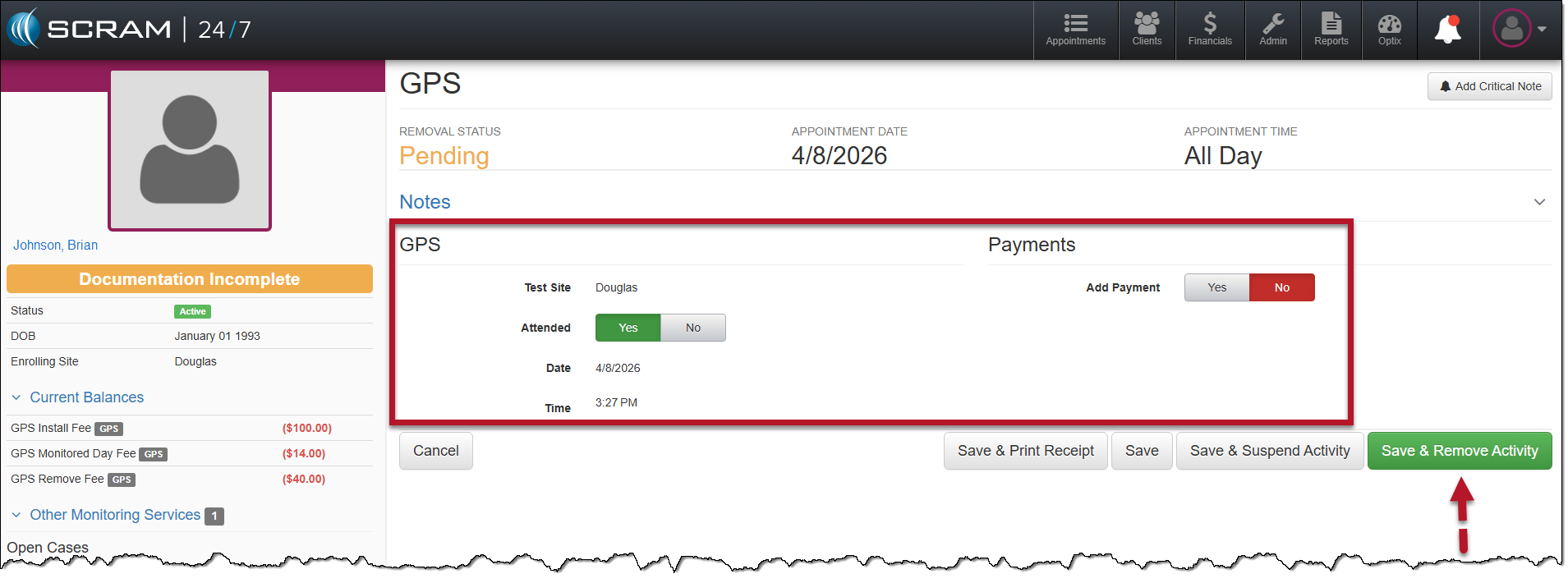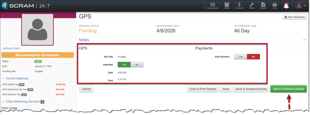 - Complete the GPS Removal appointment. Here, you may select whether the client is in attendance and record any payments made.