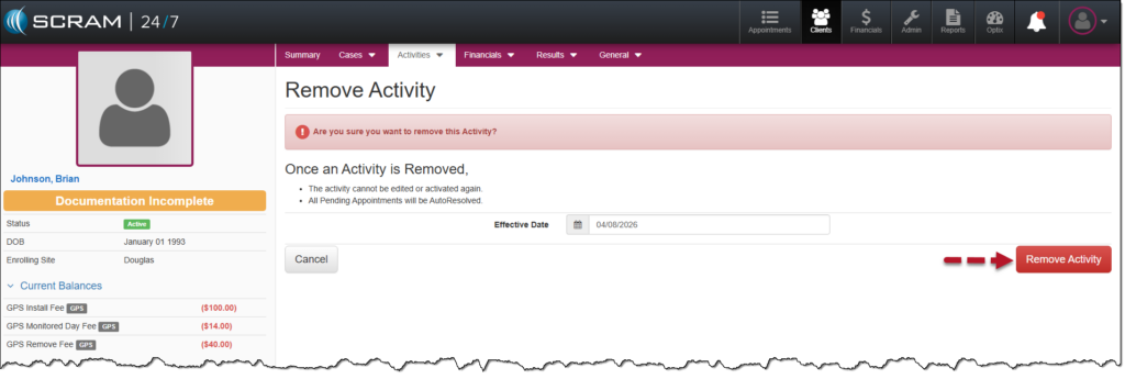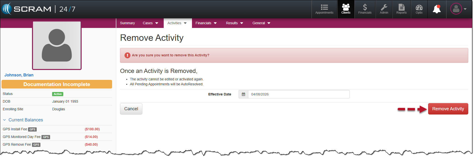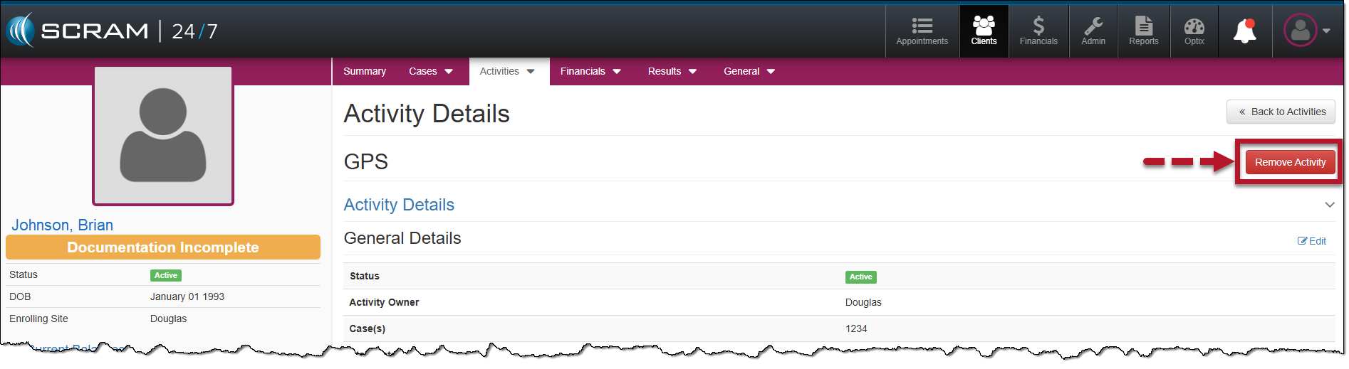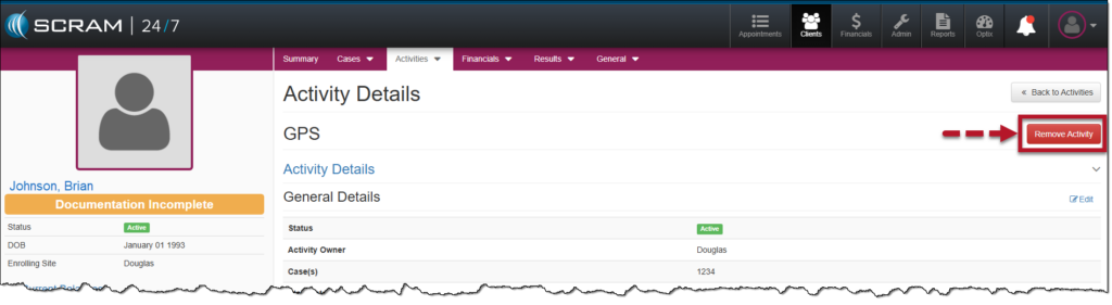 - Unassign the SCRAM GPS bracelet and Beacon when removing the GPS Activity.